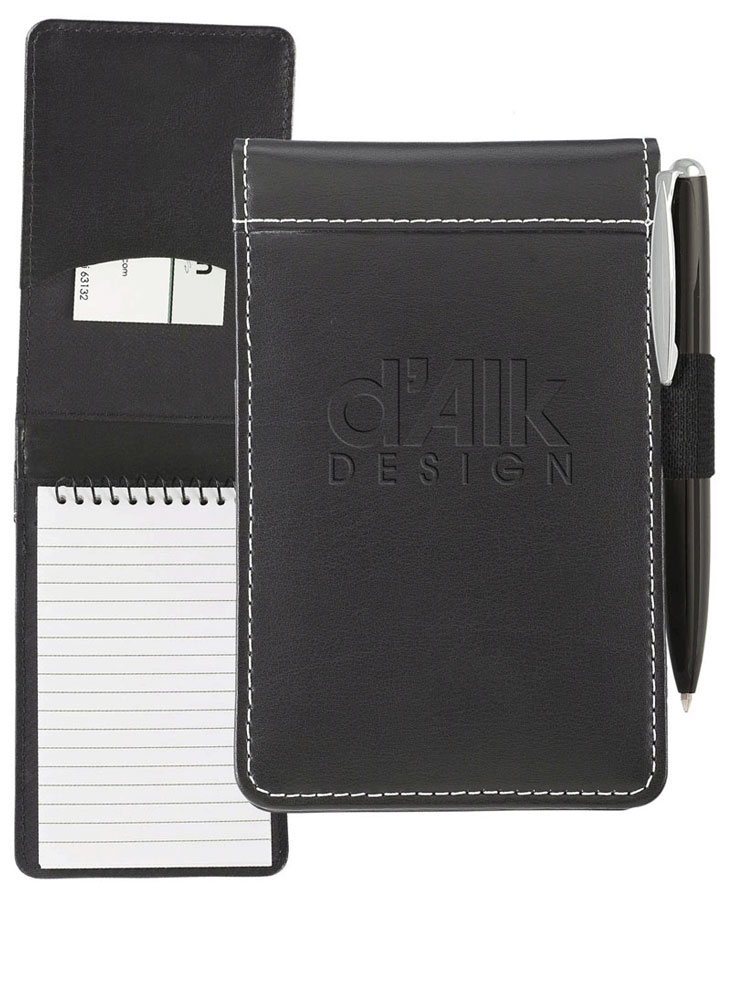 Item Info: Stitched and padded bonded leather covers. Fabric lining on the inside. Inside card pocket. Elastic pen loop (no pen included). 3" x 5" spiral pad included.