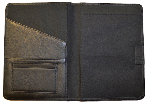 Item Info: Made of premium full-grain leather. Fabric lining interior. Elastic pen loop (no pen included). Inside slots and pockets for notes and business cards. A 5" x 8" ivory pad is included.